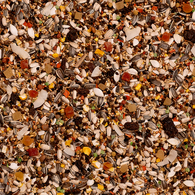 Склад: Насіння соняшнику біле, фрукти, сафлор, овес очищений, сорго червоне, гречка, насіння соняшнику смугасте, пшениця, білий дарі, конопляне насіння, ячмінь, гранули екструдовані, кедрові горіхи, насіння гарбуза.